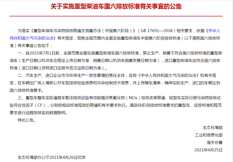 2021年4月26日,**生態(tài)環(huán)境部、工業(yè)和信息化部、海關(guān)總署印發(fā)《關(guān)于實(shí)施重型柴油車(chē)國(guó)六排放標(biāo)準(zhǔn)有關(guān)事宜的公告》(公告 2021年 第14號(hào))。