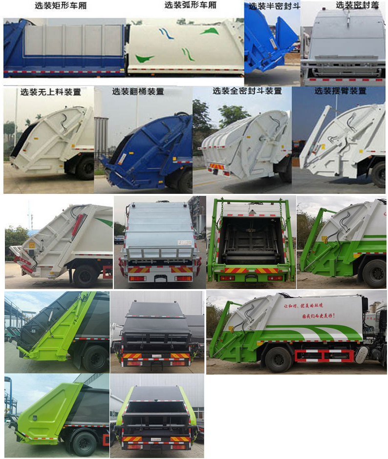 其它 | 1、該車主要專用裝置由箱體、壓縮系統(tǒng)組成,用于垃圾的收集與清運(yùn)。該車可選裝方形或弧形箱體,選裝全密封蓋裝置,選裝方形擋泥板,選裝側(cè)防護(hù)連接結(jié)構(gòu)件,選裝側(cè)防護(hù)樣式。選裝后部工作裝置。選裝多路閥位置,液壓油箱位置。選裝爬梯樣式;選裝工作裝置時(shí)外形長/前懸/軸距/后伸對應(yīng)關(guān)系為(mm):①無上料裝置:8680/1400/4500/-,8710/1430/4500/-,8880/1400/4700/-,8910/1430/4700/- ;②全密封斗裝置和擺臂裝置:8880/1400/4500/200,8910/1430/4500/200,9080/1400/4700/200,9110/1430/4700/200;③翻桶裝置和翻斗裝置:9080/1400/4500/400,9110/1430/4500/400,9280/1400/4700/400,9310/1430/4700/400。僅采用4500mm,4700mm軸距。2、側(cè)防護(hù)采用冷彎型鋼/Q235,螺栓連接;后防護(hù)由專用裝置替代,下邊緣離地高:500mm。3、隨底盤選裝選裝高度不同的駕駛室;選裝前霧燈;選裝駕駛室頂部裝飾燈;選裝駕駛室前面罩;選裝前保險(xiǎn)杠及前部燈具,選裝后視鏡;選裝后部燈具;選裝駕駛室前臉擾流罩;駕駛室臥鋪側(cè)窗選裝裝飾板,選裝后背式排氣管。安裝帶有衛(wèi)星定位功能的行駛記錄儀。ABS型號/生產(chǎn)廠家:3631010-C2000/東科克諾爾商用車制動系統(tǒng)(十堰)有限公司,ABS 8/東科克諾爾商用車制動系統(tǒng)(十堰)有限公司, 4460046450/威伯科汽車控制系統(tǒng)(中國)有限公司,J ABS/焦作博瑞克控制技術(shù)有限公司。采用的發(fā)動機(jī)與油耗值對應(yīng)關(guān)系為(L/100Km):DDi50E190-60/23.9,D4.5NS6B190/24.4,D6.7NS6B230/23.7,B6.2NS6B210/23.8,B6.2NS6B230/23.8。隨底盤選裝油箱位置。選裝箱體樣式,填裝器樣式。隨底盤選裝后處理、電瓶、尿素罐、備胎安裝位置。選裝油管布局. | ||