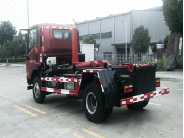 ★勾臂垃圾車的拉臂采用滑臂式結(jié)構(gòu),工作人員通過主油缸和滑臂油缸完成裝廂﹑卸廂和卸料動(dòng)作。